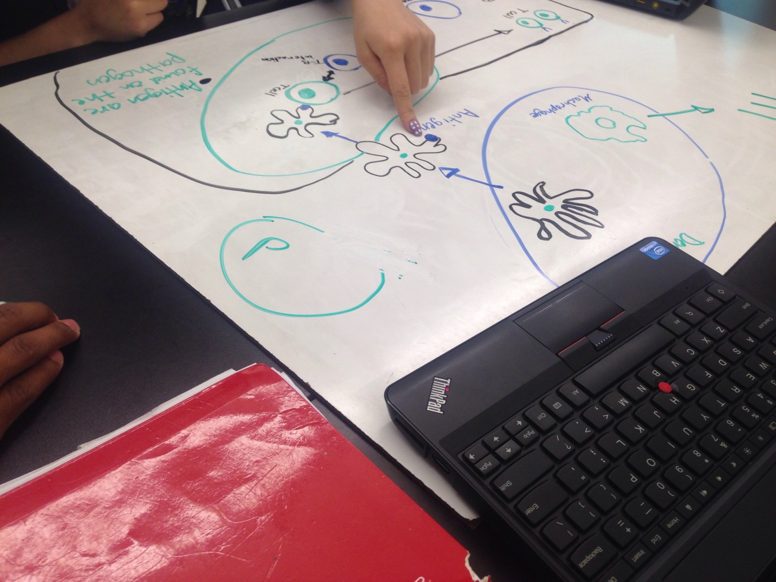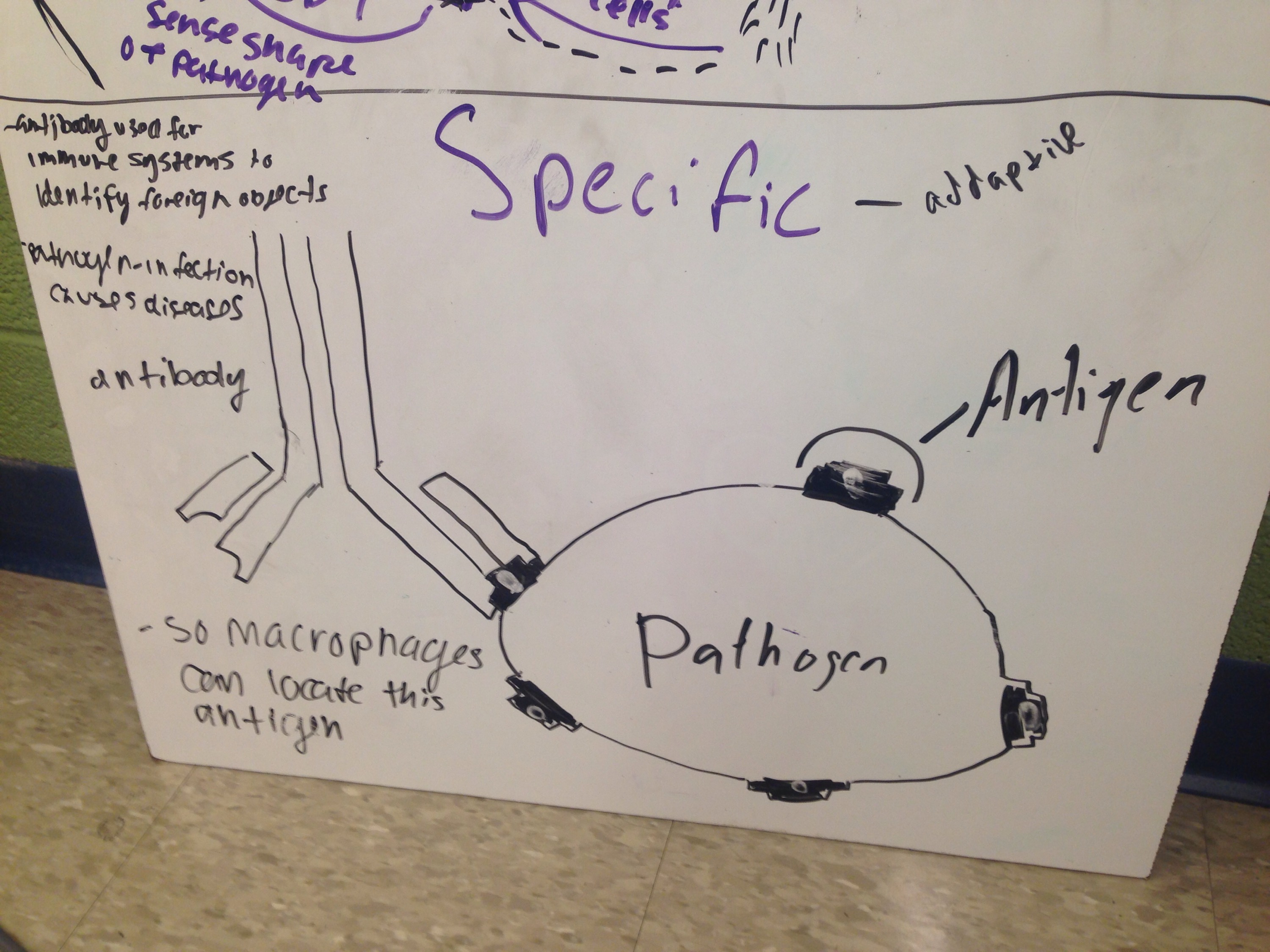 At one point, a group of students could not figure out the difference between antigens and pathogens, but another group that had figured out the difference took pride in going around and sharing their work with other groups. It was beautiful. Here is part of that group’s board that clearly shows the difference: