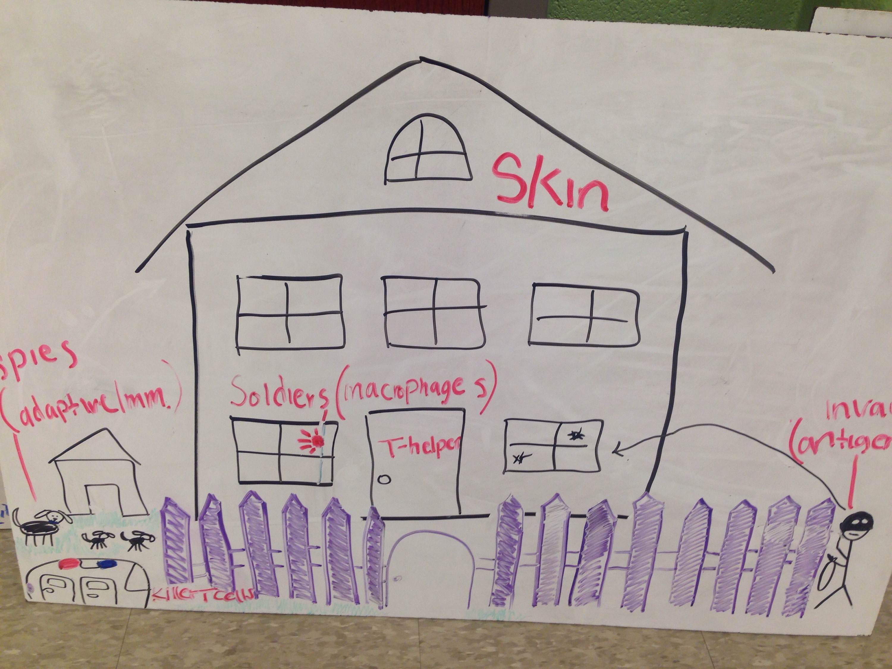 In class the next day (our first official day with this system), I had students in groups of two sketch out a diagram to explain the processes of innate and adaptive immunity. About half the groups more or less copied the diagram from the video onto their whiteboard, but it still made them think about the process. Other groups really explained the process in their own semi-unique designs, including a house and a castle metaphor (which was a bit confusing, but still creative and helpful for the groups making them). Here are a few examples below: