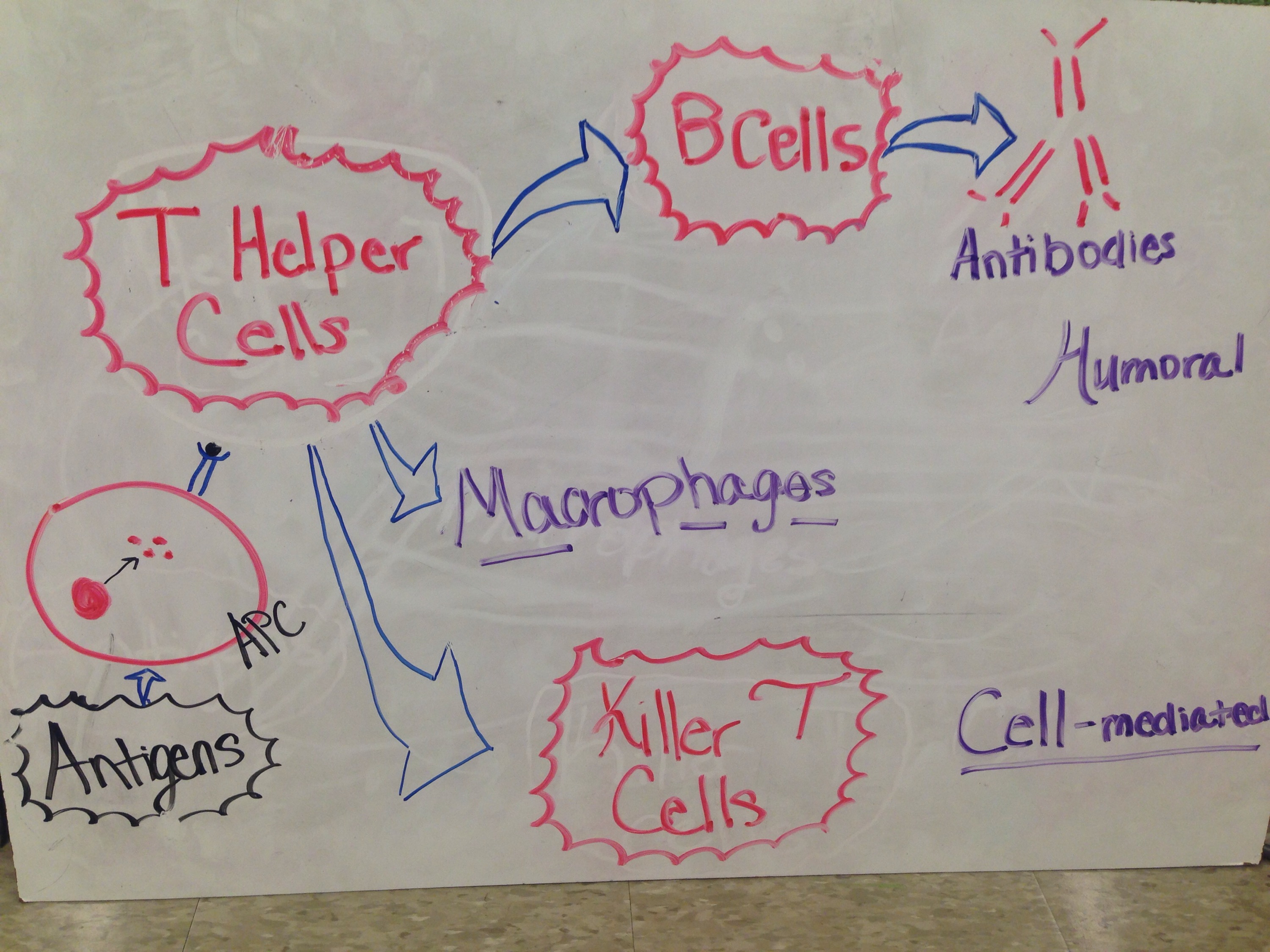 Example 2: Another good board, but simpler. This required me to ask the group a lot more probing questions, such as, “Do the T helper cells become B cells? Or do they just communicate? What’s going on there?” If they couldn’t answer right away, I would leave them with a few good questions (unanswered) and come back later. When I got back to them, they usually had figured it out and were eager to share what they had learned.
