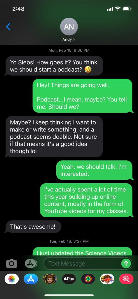 The first step is to get a stupid idea and share it with a friend who might think the idea isn’t completely stupid. And just like the time senior year of high school when Andy told me we should get tattoos, I thought starting a podcast sounded like a thing we could totally do and not regret it later. Here’s what that stage looked like for us: