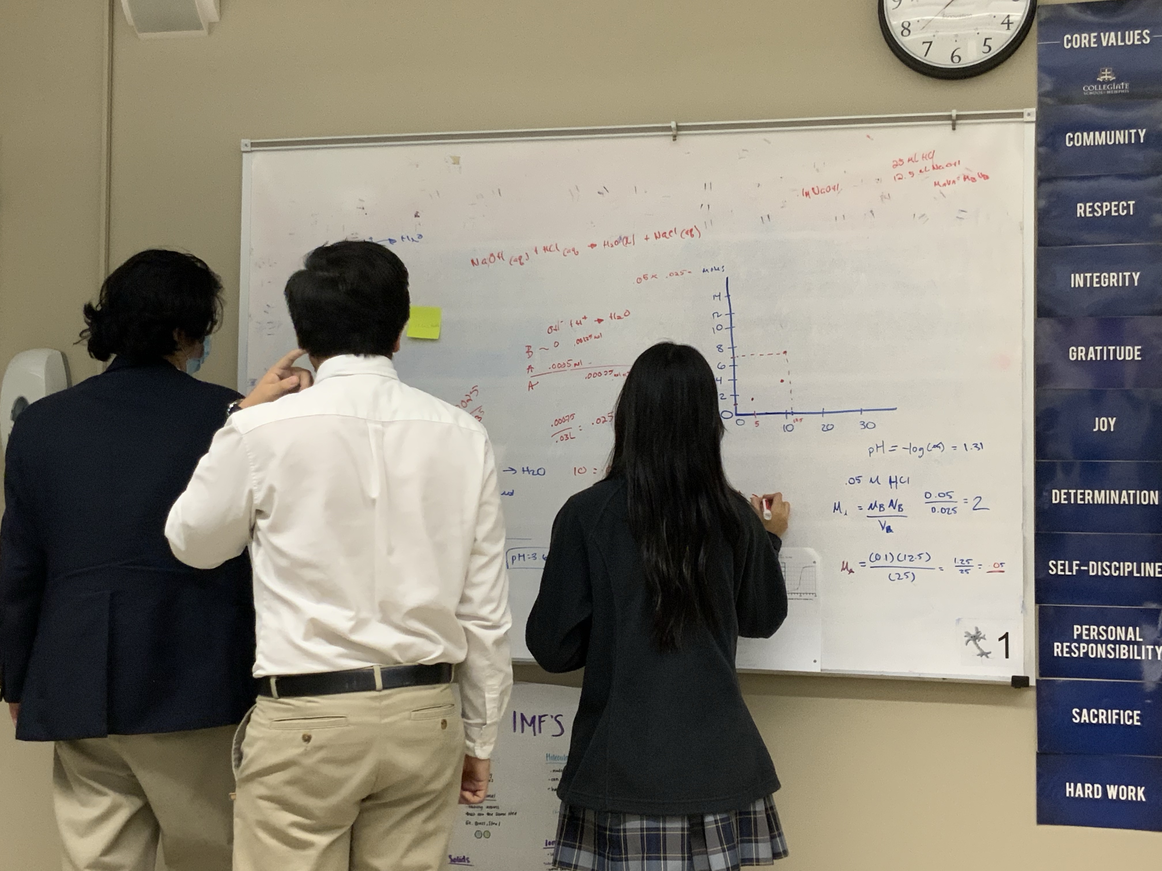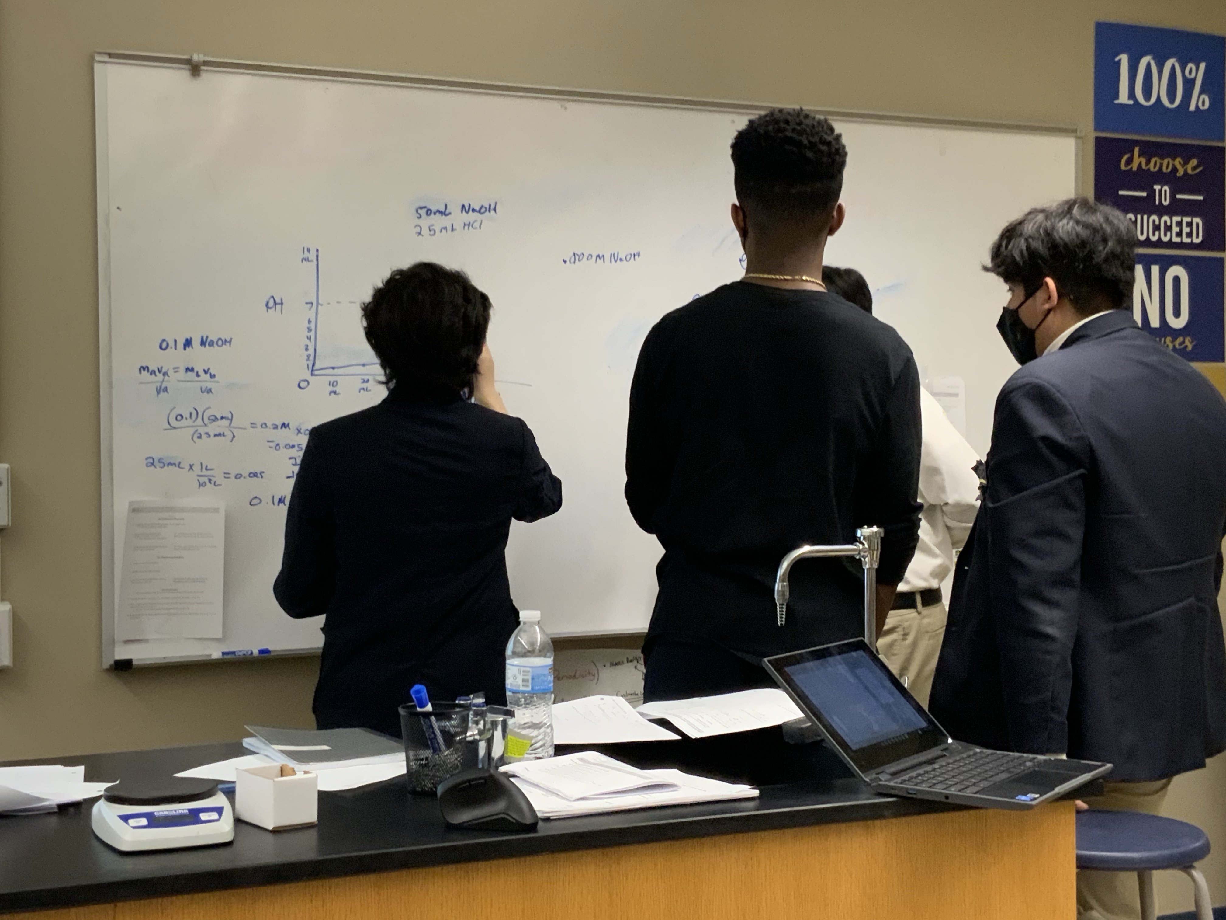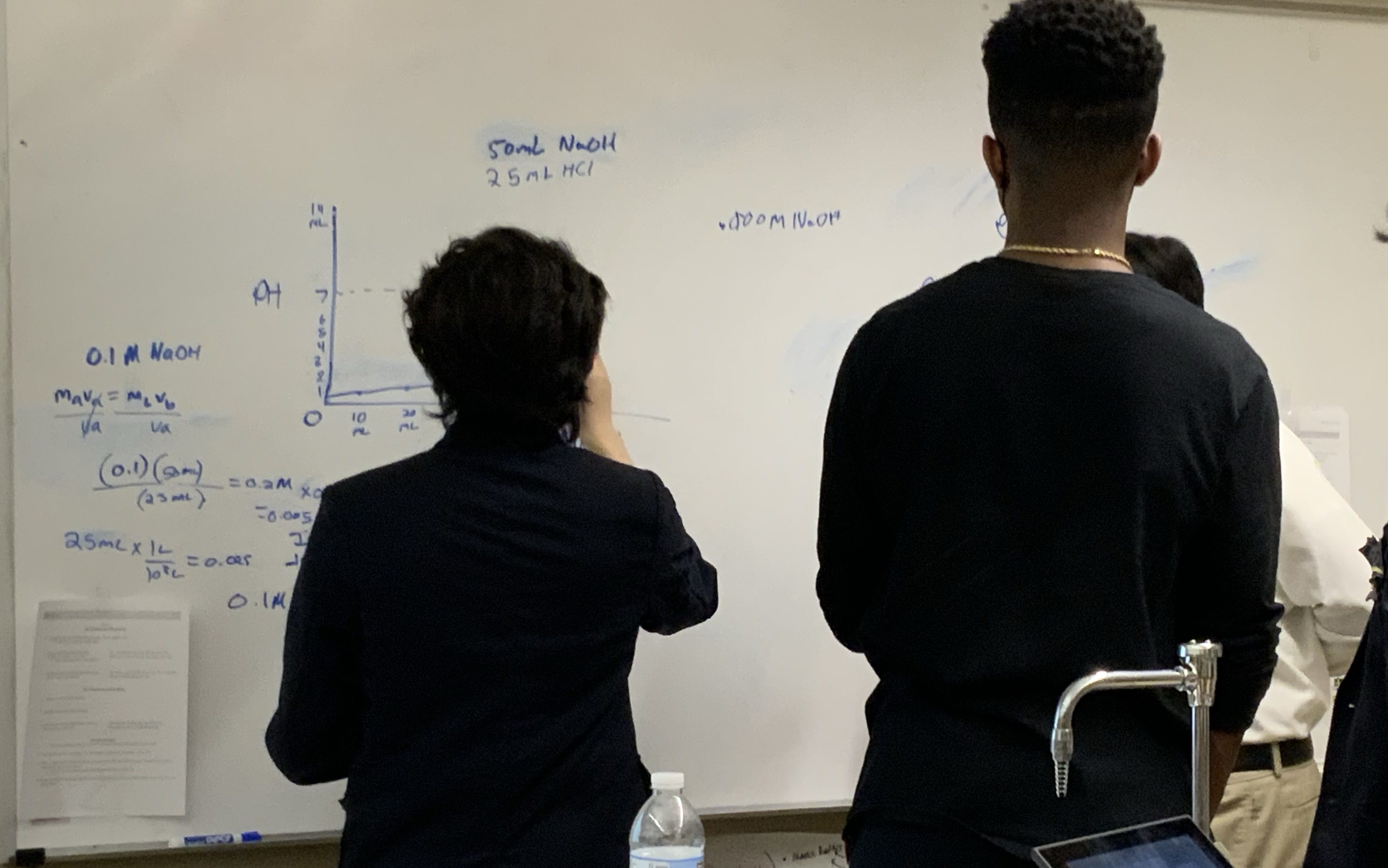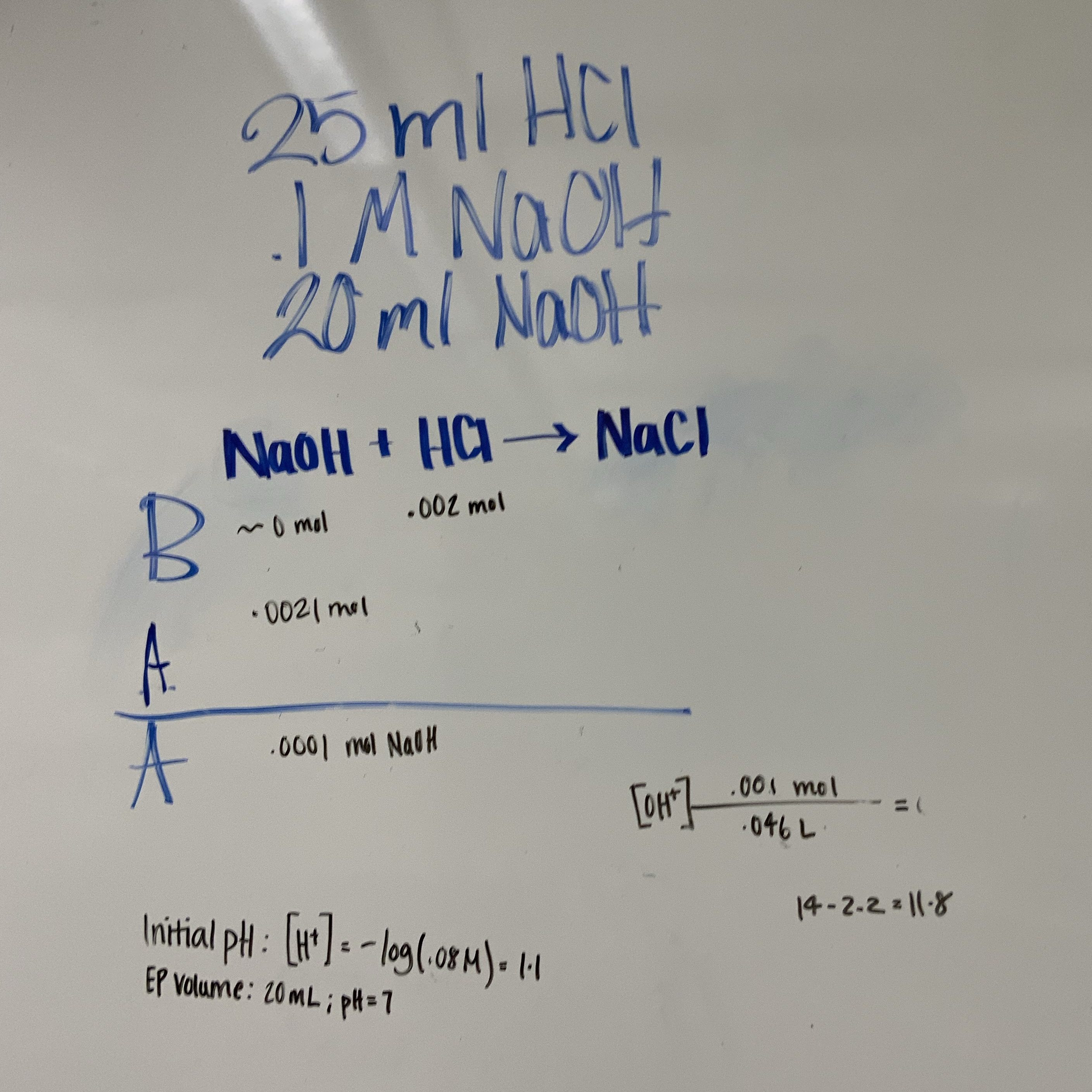 Student worked in small random groups of about 3 or 4 at vertical whiteboards (a la Building Thinking Classrooms principles, which I use in my classes) to calculate the initial acid molarity and the pH of points along the graph.