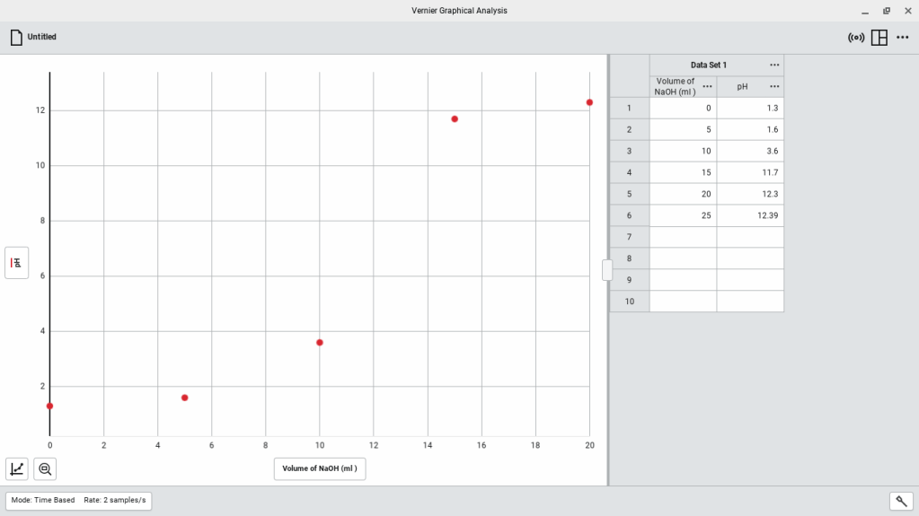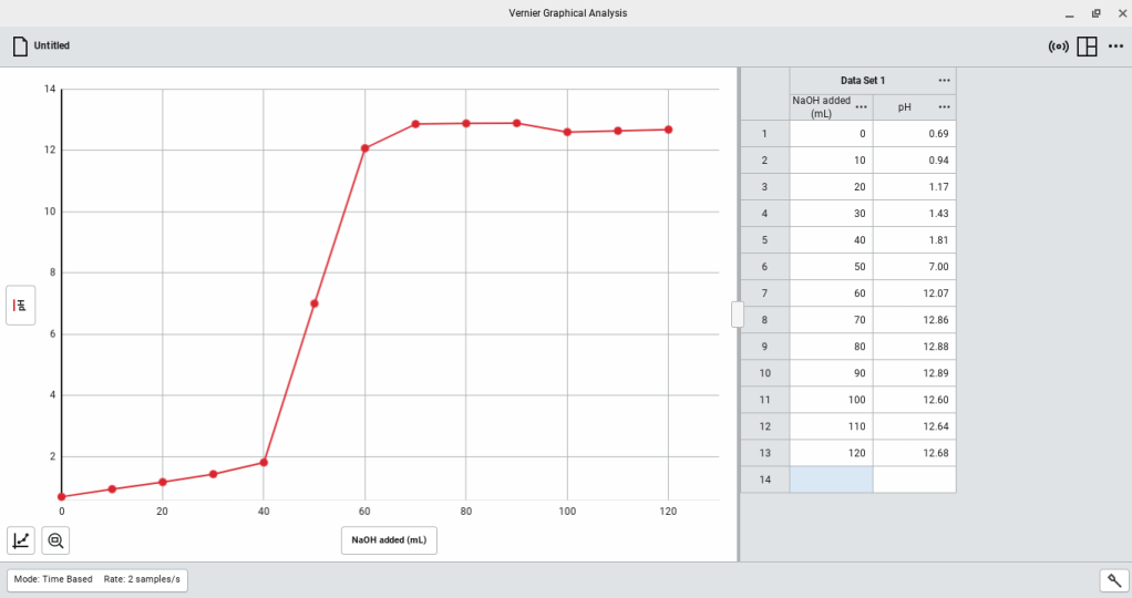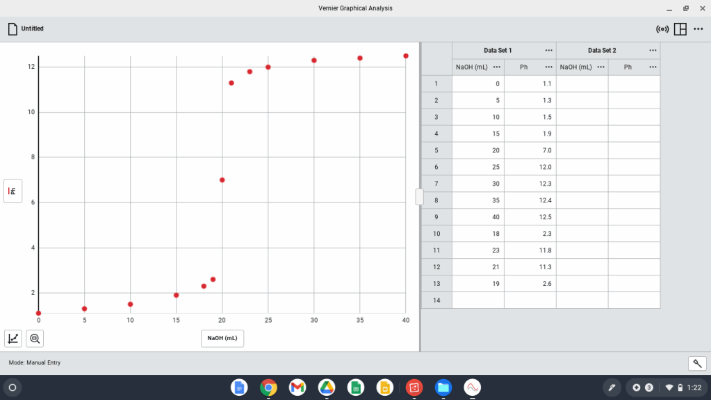 This group took the longest, but they at least got practice calculating pH. I’m not sure why they didn’t include the equivalence point pH of 7, but I’ll follow up with them next class.