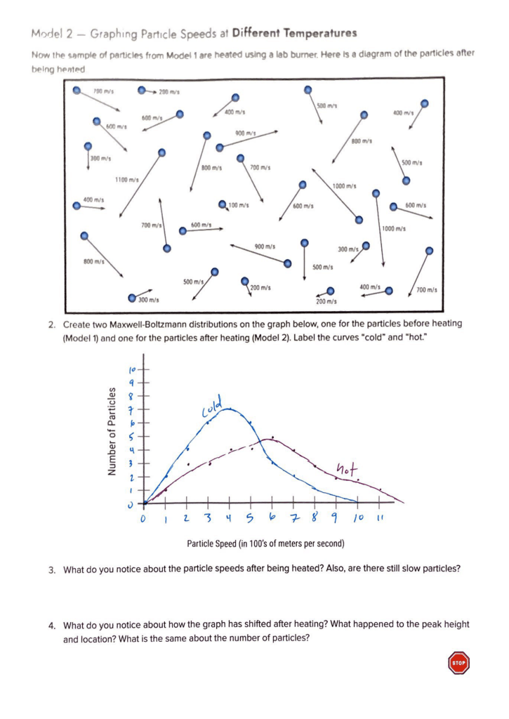 In Model 2, I show the same sample of gas after it has been heated. Students repeat the process, showing both curves on the same graph so they can see how the graph shifts at higher temperatures.